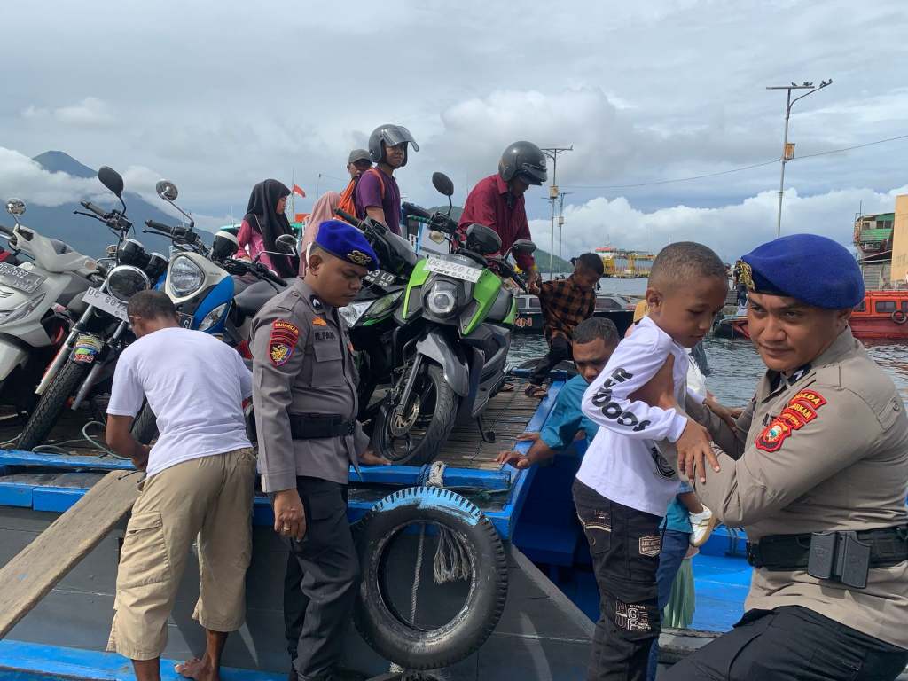 Personil Ditpolairud Polda Maluku Utara juga terlihat membantu warga yang berpergian ketika membutuhkan.