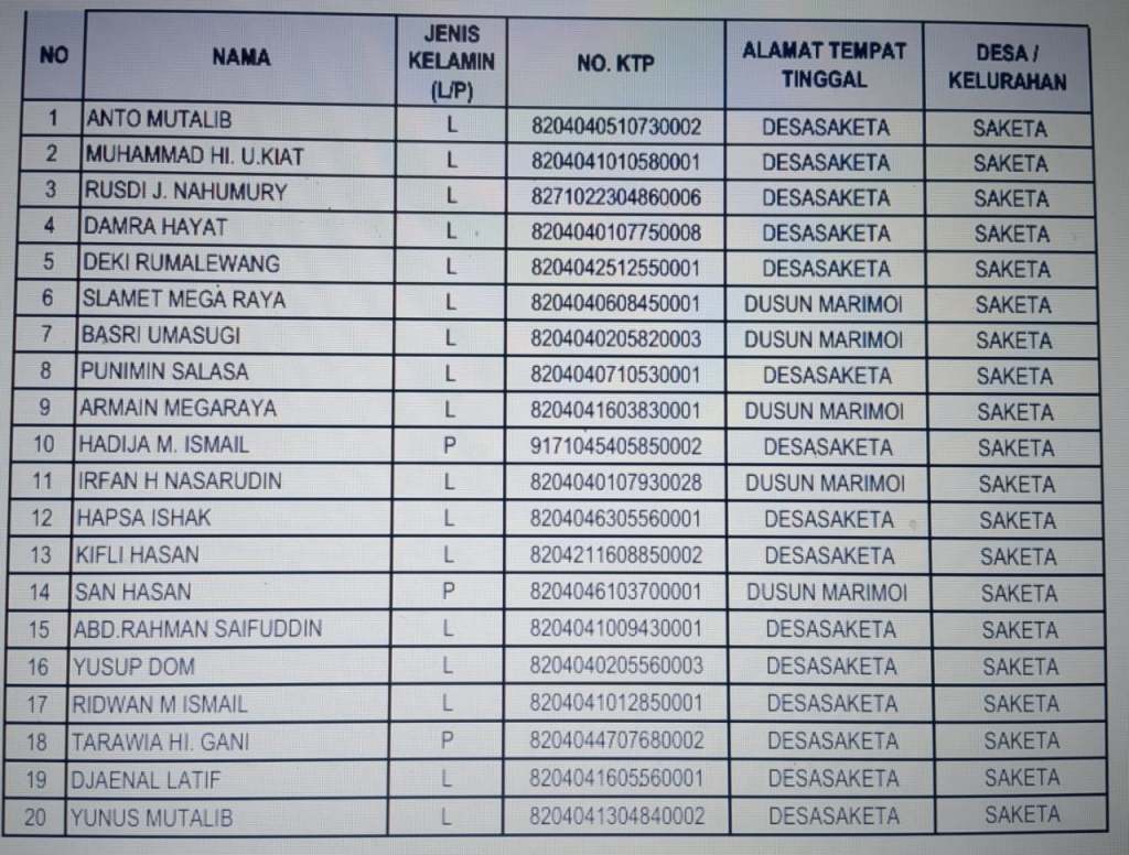 Hal ini diduga lantaran adanya perubahan data yang diduga dilakukan oleh Kepala Desa (Kades) Saketa, Idjul M. Kiat, bersama petugas verifikasi, dengan memasukan nama orang dekat mereka.