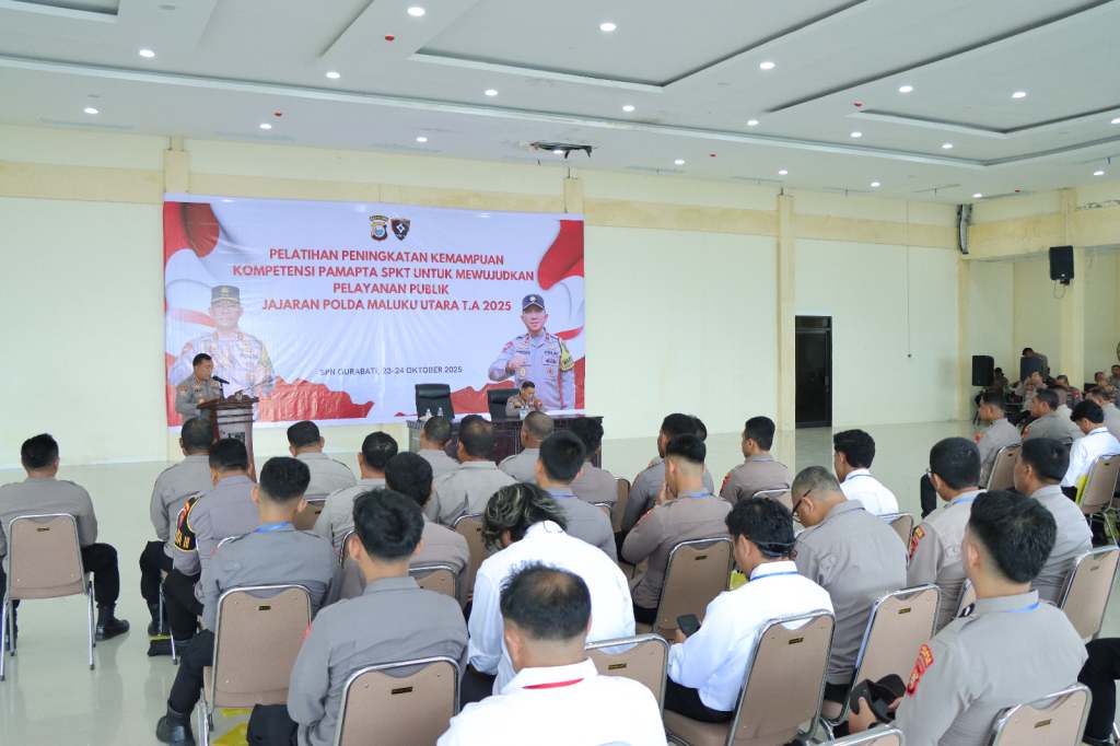 Klikfakta.id, TIDORE — Kepolisian Daerah (Polda) Maluku Utara menggelar pelatihan peningkatan kemampuan kompetensi pamapta pada Sentra Pelayanan Kepolisian Terpadu (SPKT) Kamis (23/10/2025) kemarin.