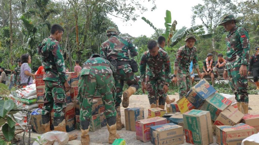 Prajurit berjalan kaki sekitar lima kilometer untuk menyalurkan bantuan logistik ke Desa Naga Timbul, Desa Mompang, dan Desa Mardame setelah akses jalan menuju wilayah tersebut terputus total.