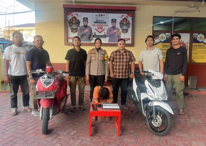 Terduga pelaku ditangkap dengan barang bukti sepeda motor Yamaha Mio M3 warna putih bernomor polisi DG 6099 QX dan nomor mesin E3R2E-376443, serta nomor rangka MH3SE88H0SJ72386.