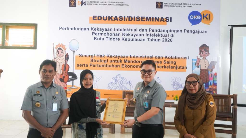 Klikfakta. id, TERNATE– Kantor Wilayah (Kanwil) Kementerian Hukum (Kemenkum) Maluku Utara (Malut) menyelenggarakan kegiatan Diseminasi Kekayaan Intelektual (KI) berupa sosialisasi dan pendampingan pendaftaran KI dengan tema “Sinergi Hak Kekayaan Intelektual dan Kolaborasi Strategi untuk Mendorong Daya Saing serta Pertumbuhan Ekonomi Lokal Berkelanjutan”, Selasa (24/2)/2026, di Gedung PLUT KUMKM Kota Tidore Kepulauan, Kelurahan Indonesiana.