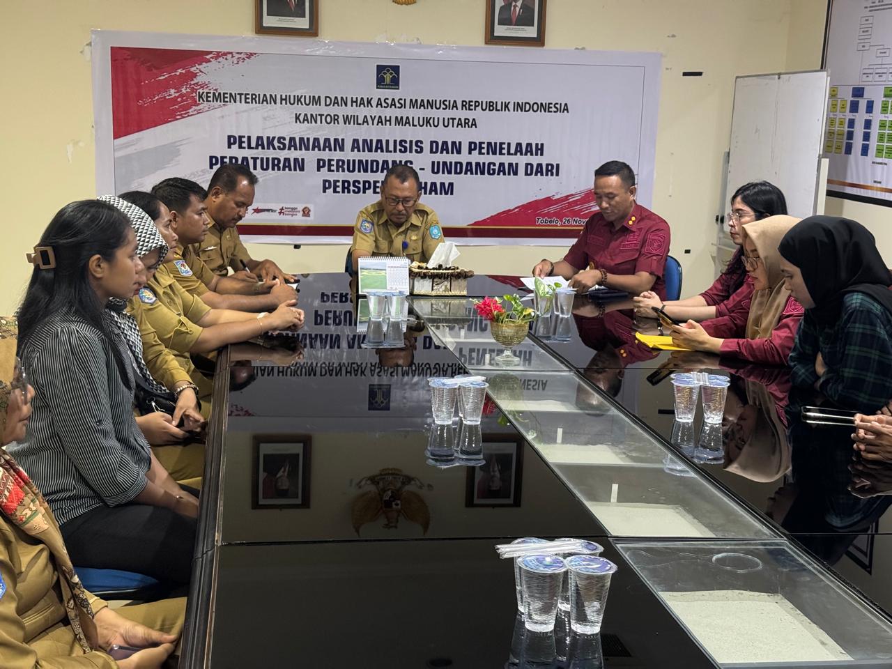 Kabid HAM, Burhani Hadad saat melakukan inventarisasi peraturan perundang-undangan berperspektif HAM di ruang rapat Sekretariat Daerah Kab. Halut bersama Staf Ahli Bidang Pemerintahan, Politik dan Hukum, Valentino dan jajarannya, menyampaikan bahwa Permenkumham Nomor 16 Tahun 2024 tentang Pedoman Pengarusutamaan HAM dalam Pembentukan Peraturan Perundang-undangan patut menjadi landasan dalam perumusan Perda berbasis HAM Pemda Kab/Kota.