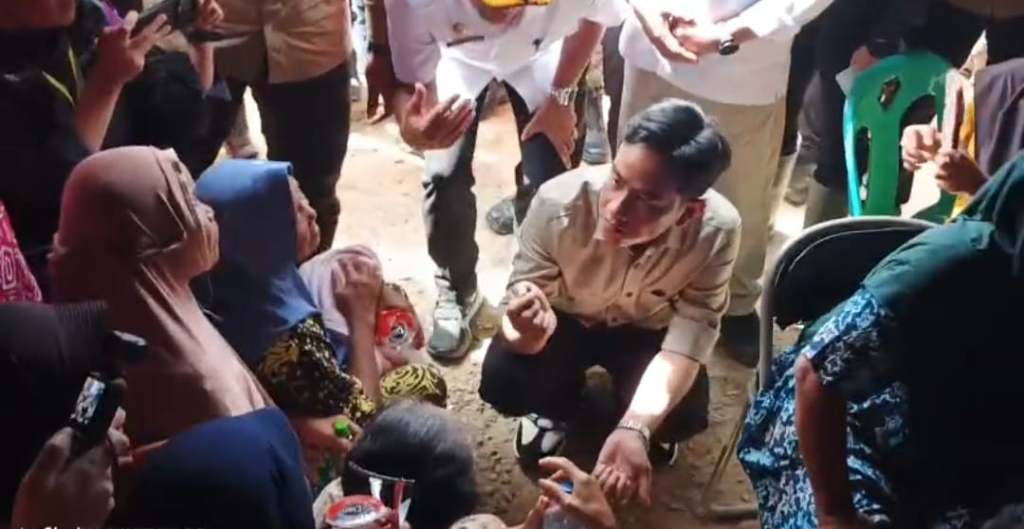 Begitu memasuki tenda, Gibran langsung berjongkok dan berbaur bersama para pengungsi. Warga terlihat antusias beberapa bahkan langsung mengabadikan momen itu dengan kamera ponsel mereka.