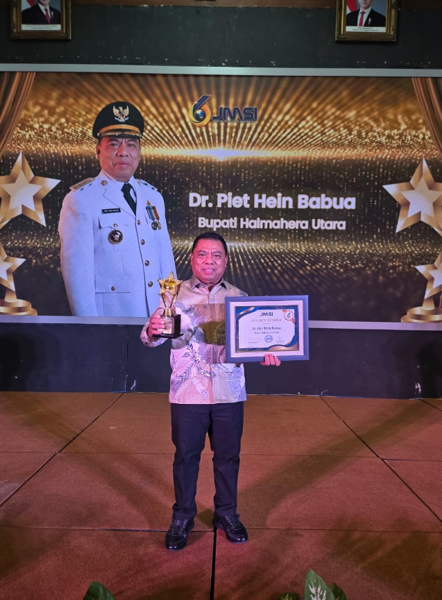 Bupati Halmahera Utara Peit Hein Babua menerima langsung penghargaan Golden Leader Indonesia 2026 atas inovasi terhadap penyelenggaraan pemerintah di daerah atas produk produk atau komunitas di Halmahera Utara.