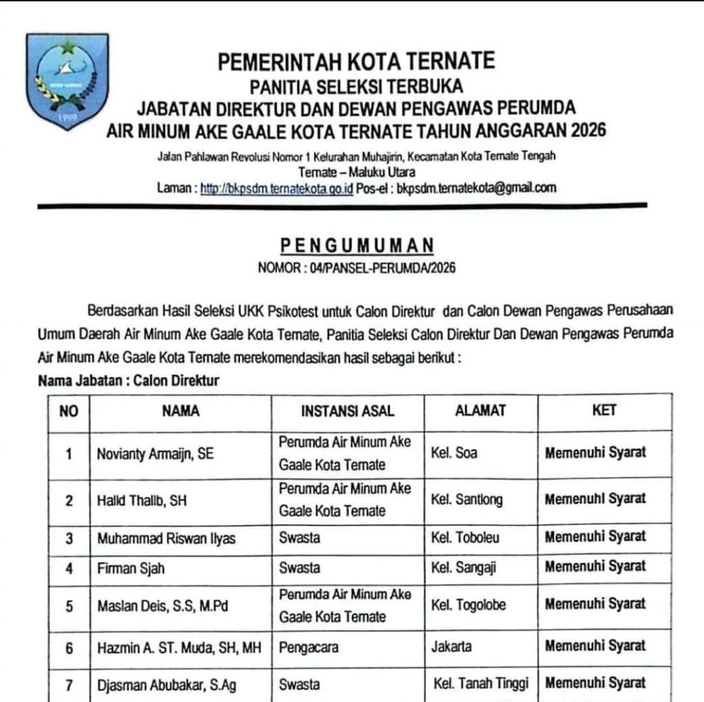 Sekedar informasi saat ini pansel Direktur dan Dewas Perumda Ake Gaale Kota Ternate telah menetapkan 10 calon peserta yang lolos seleksi dengan rincian 7 calon Direktur dan 3 calon Dewas termasuk oknum yang diduga terlibat dugaan makelar proyek.