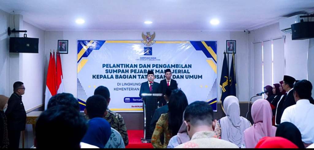 Klikfakta. id, TERNATE– Kepala Kantor Wilayah (Kakanwil) Kementerian Hukum (Kemenkum) Maluku Utara (Malut), Budi Argap Situngkir memimpin langsung pelantikan dan pengambilan sumpah pejabat manajerial Kepala Bagian Tata Usaha dan Umum di lingkungan Kemenkum Malut, bertempat di Aula Gamalama lantai I Kanwil, Kamis (11/12/2025).