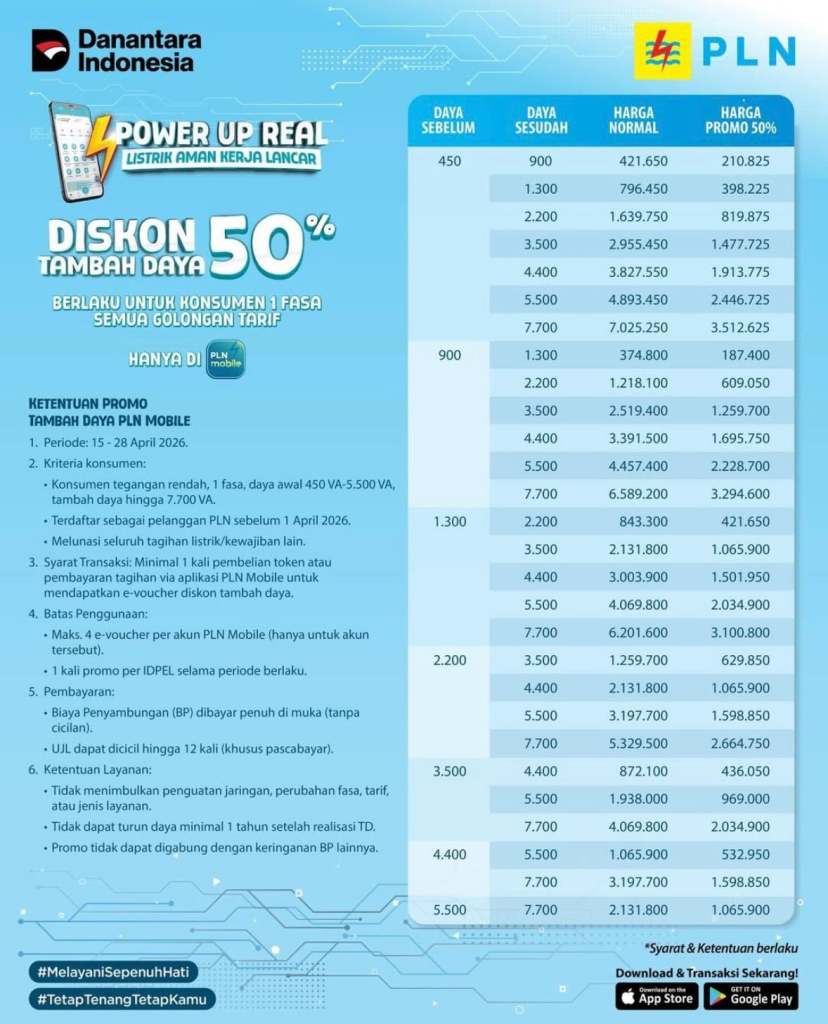 “Melalui promo tambah daya ini, PLN ingin memberikan kemudahan bagi masyarakat untuk meningkatkan kapasitas listrik sesuai kebutuhan dengan biaya yang lebih ringan. Kami mengajak masyarakat untuk memanfaatkan kesempatan ini sebelum periode promo berakhir pada 28 April 2026, ujar Noer.