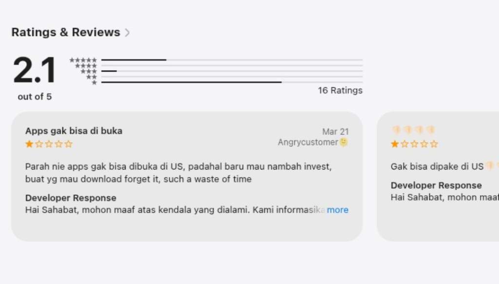 “Parah ini aplikasi enggak bisa dibuka di US, padahal baru mau nambah investasi. Yang mau download, lupakan saja, itu membuang waktu,” tulis seorang pengguna di App Store dalam ulasan pada Maret 2025.